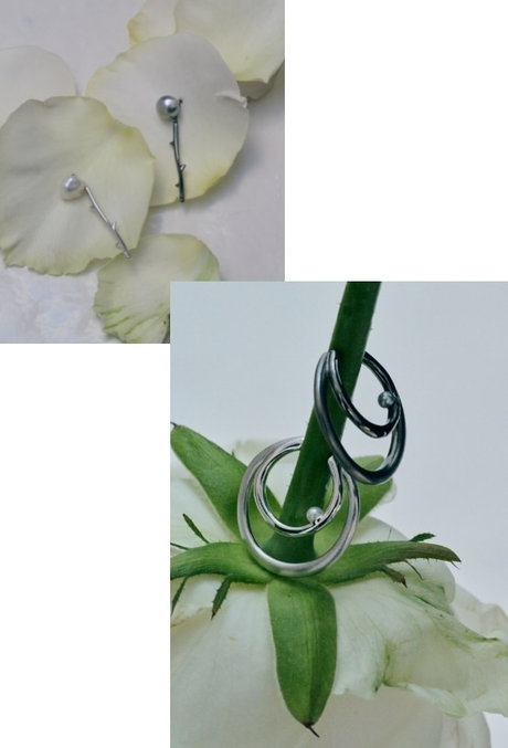 茎をかたどった有機的なラインや、ひとつひとつ異なる形を持つバロックパールを花に見立てたピアス、